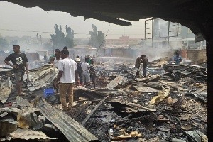 Over 40 kiosks, some cars and a bar have been burnt to ashes at a slum under the Achimota overhead bridge.